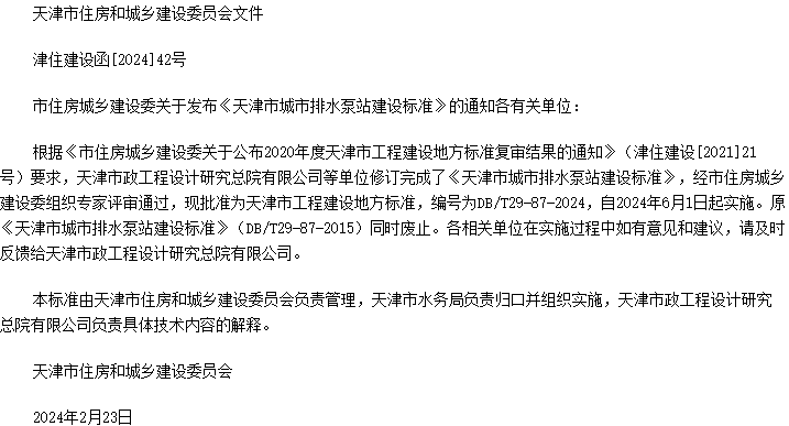 天津市城市排水泵站建设标准收藏