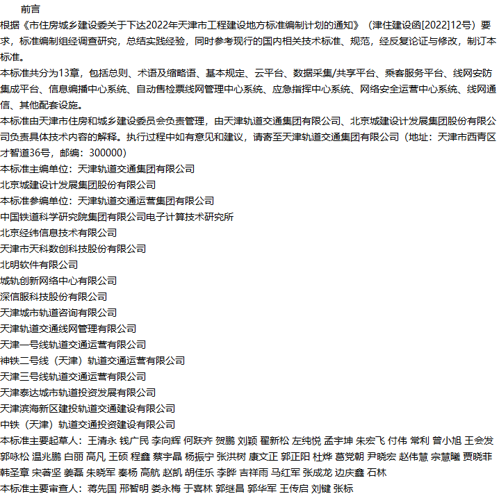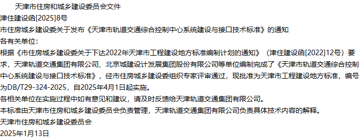 天津市轨道交通综合控制中心系统建设与接口技术标准收藏